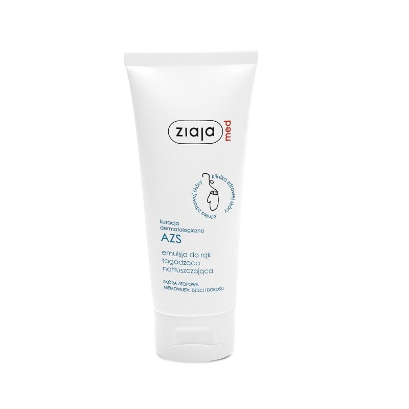 Emulsja do rąk Ziaja Med AZS o działaniu natłuszczająco-łagodzącym przeznaczona jest do pielęgnacji skóry suchej, skłonnej do podrażnień oraz z atopią. Zawiera 95% substancji pochodzenia naturalnego.