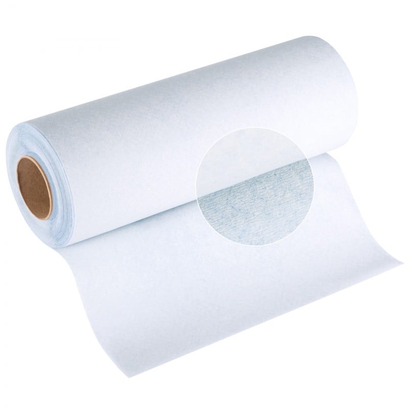 Serweta została wykonana z dwóch rodzajów materiału. Strona lewa (od strony pacjenta) to folia polietylenowa o właściwościach barierowych, a strona prawa (od strony personelu) to bibuła higieniczna wykazująca właściwości chłonne.