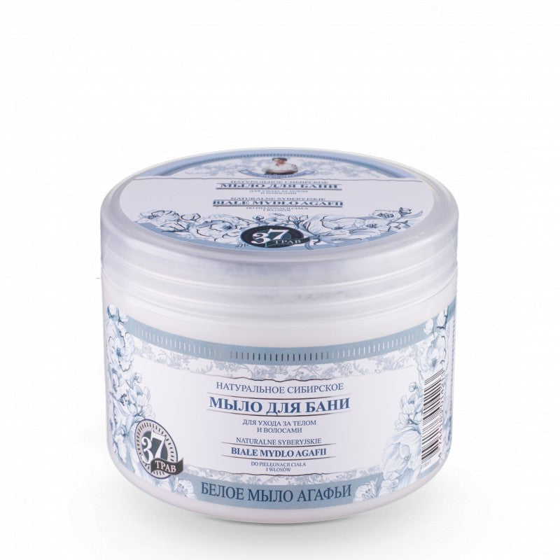 Syberyjskie Białe Mydło Babuszka Agafia to uniwersalny kosmetyk w postaci żelu (pasty) zamkniętej w słoiczku przeznaczony do pielęgnacji całego ciała i włosów. Z powodzeniem zastępuje drogeryjny żel pod prysznic - jest wydajne i pięknie pachnie.