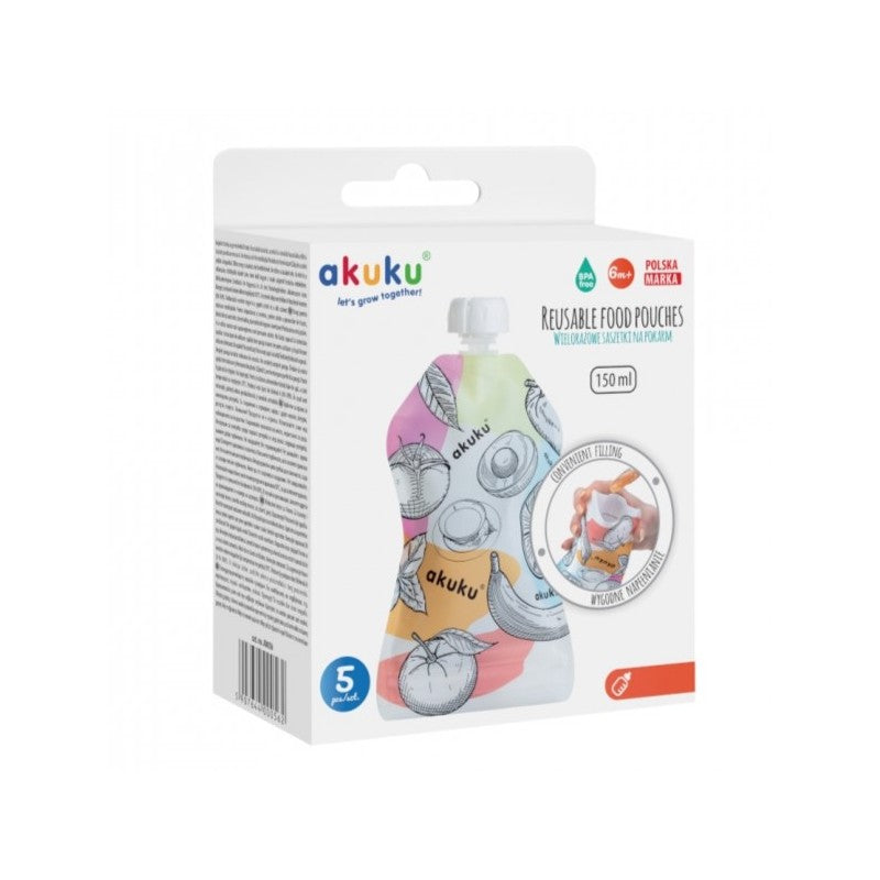 Wielorazowe saszetki na pokarm marki Akuku polubi każdy rodzic przygotowujący swojemu dziecku własnoręcznie przekąski w postaci musów owocowych, przecierów, jogurtów, zupek itp. Saszetki posiadają podwójne strunowe zamknięcie, zabezpieczające przed wylaniem zawartości, a także wygodną nakrętkę. Doskonale sprawdzą się w domu i na spacerze. Są łatwe w napełnianiu, myciu i przechowywaniu. Kolorowe, wyprofilowane opakowanie zachęci maluszka do samodzielnego jedzenia.